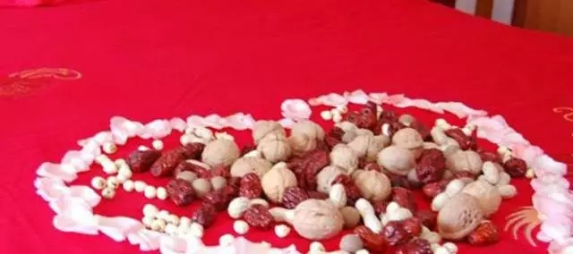 六、鋪床的流程:鋪床過程根據(jù)各地風俗不同略有差別,老一輩都知道,一般鄰居中都有這樣的人。主要流程除了掃床、鋪鴛鴦枕、龍鳳被之外,就是“撒帳(撒床)”了,將花生、桂圓、蓮子、栗子、棗等干果鋪撒在婚床上,取義“早立子、蓮生子、花生子(兒女雙全)”的祈愿。
